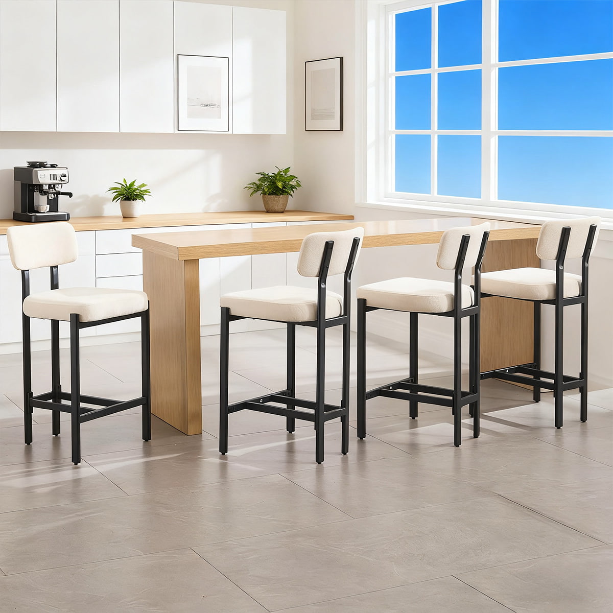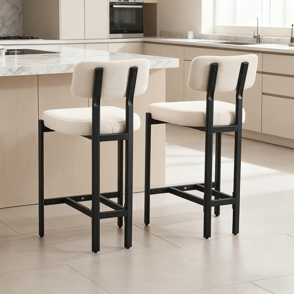 Seja para o café da manhã na ilha, coquetéis no bar ou refeições casuais, esses bancos de bar estofados elevam o seu espaço com charme e funcionalidade sem esforço. Suas linhas simples e tons neutros os tornam perfeitos para residências, cafés, restaurantes e projetos de hospitalidade.