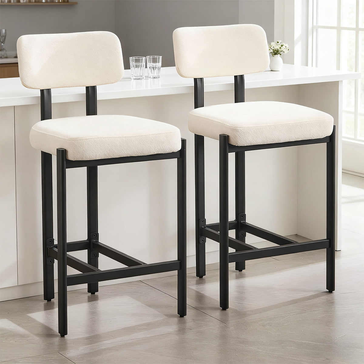 Bancos de bar modernos BeigeChenille com altura de balcão - Cadeiras de bar estofadas e curvas com pernas de metal e apoio para os pés para ilha de cozinha, bar doméstico ou sala de jantar