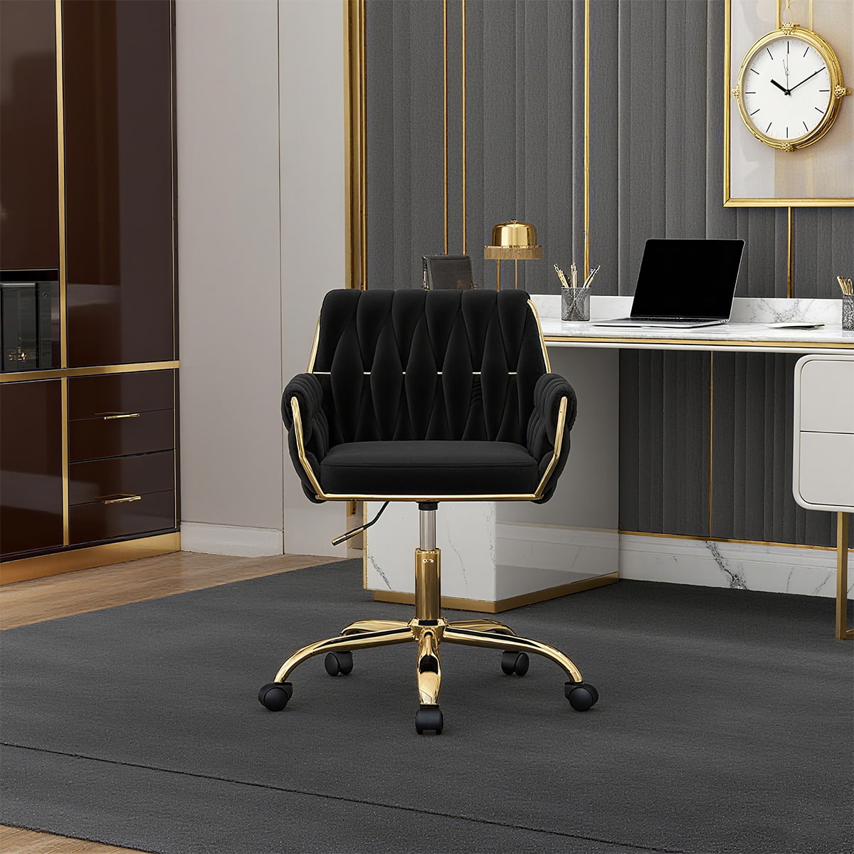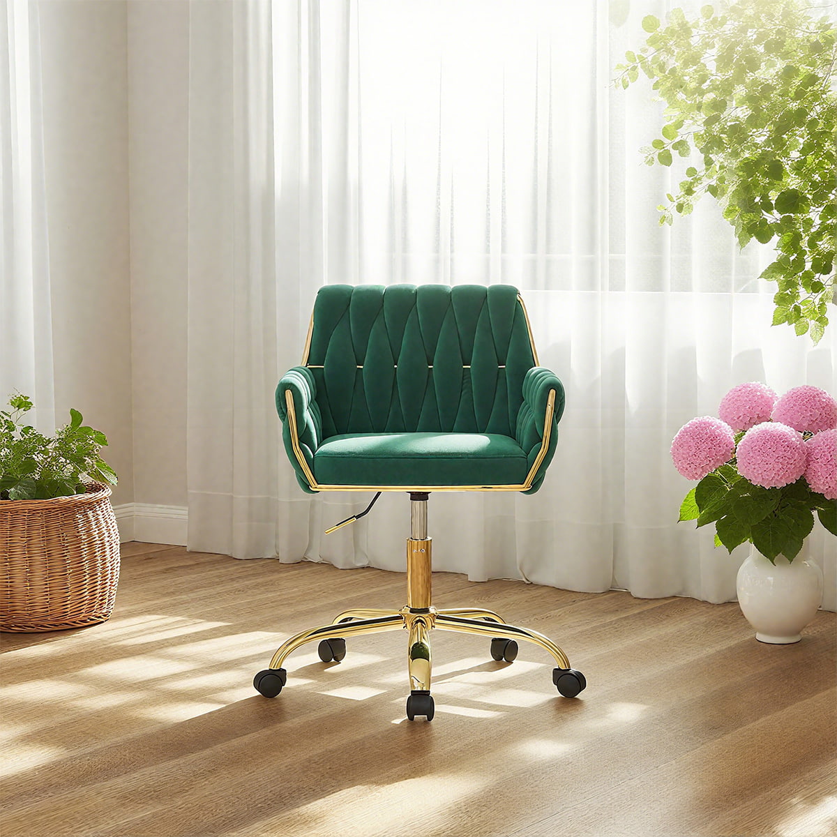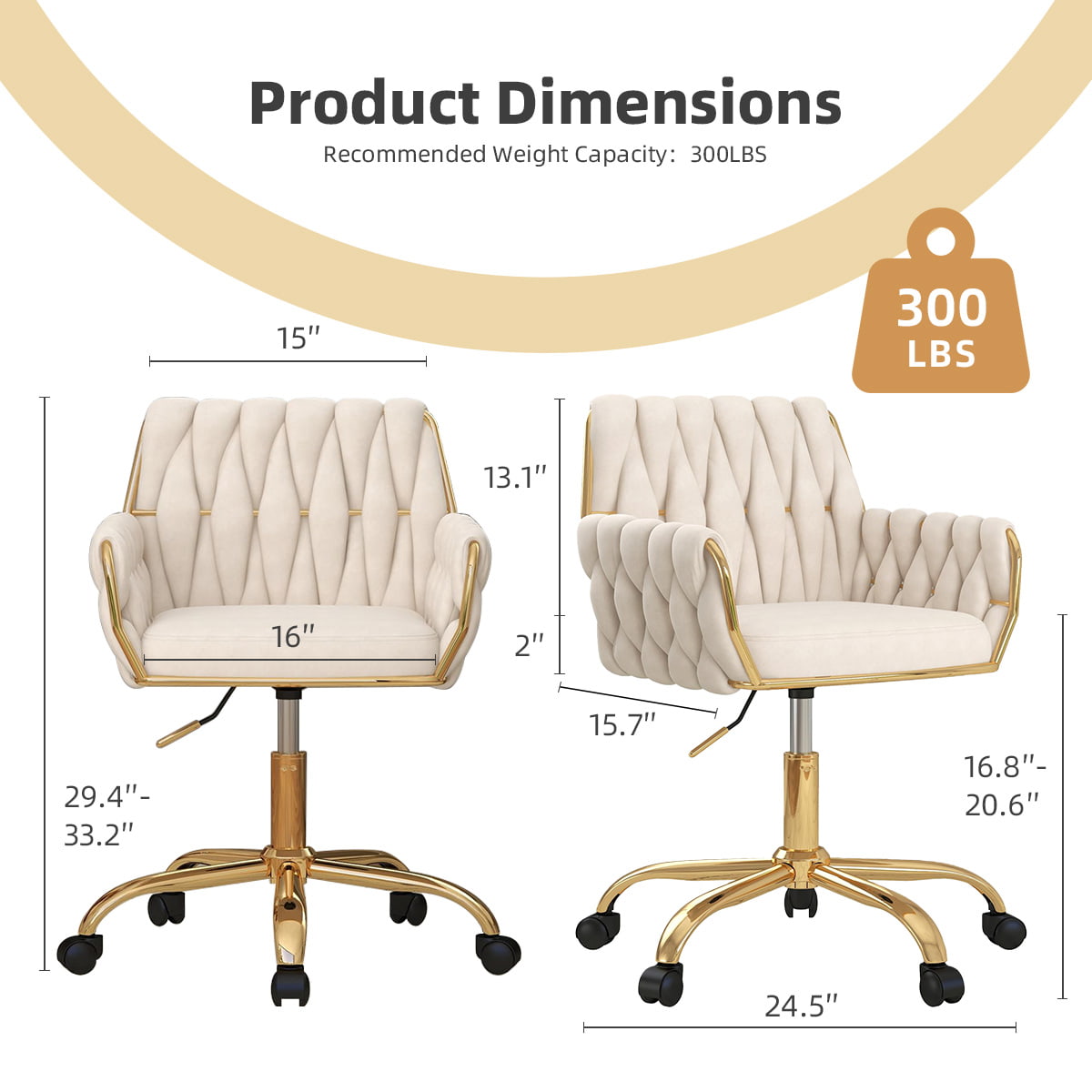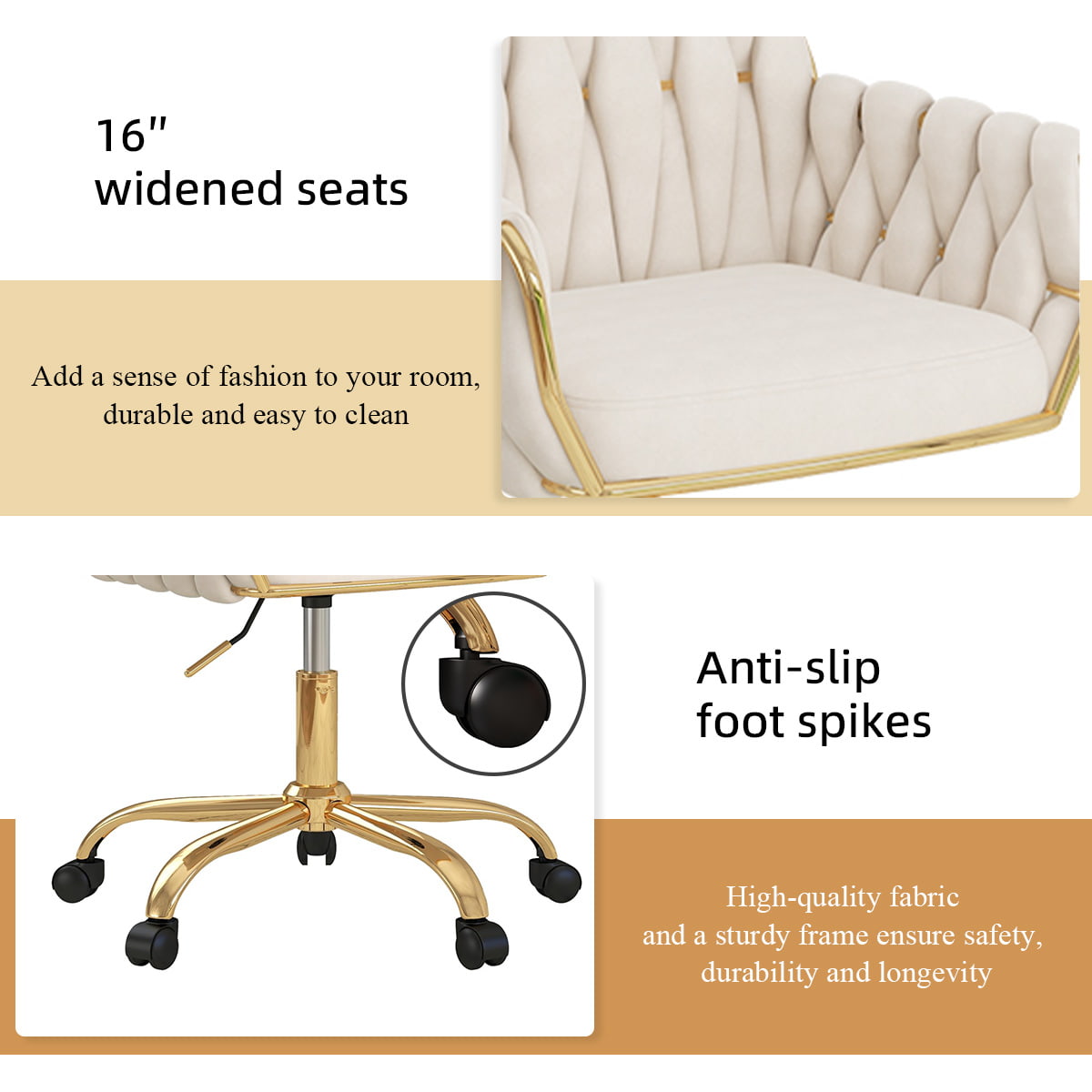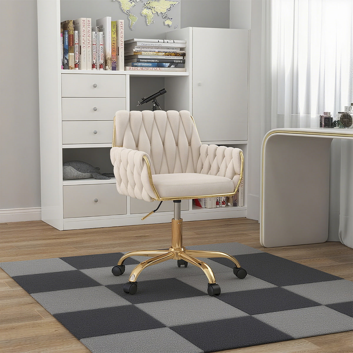 Cadeira de escritório doméstico de veludo bege - cadeira moderna ajustável com base dourada, encosto e apoio de braço tecidos à mão, cadeira giratória de mesa giratória 360 °