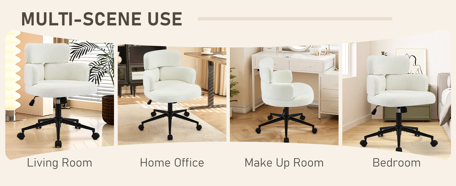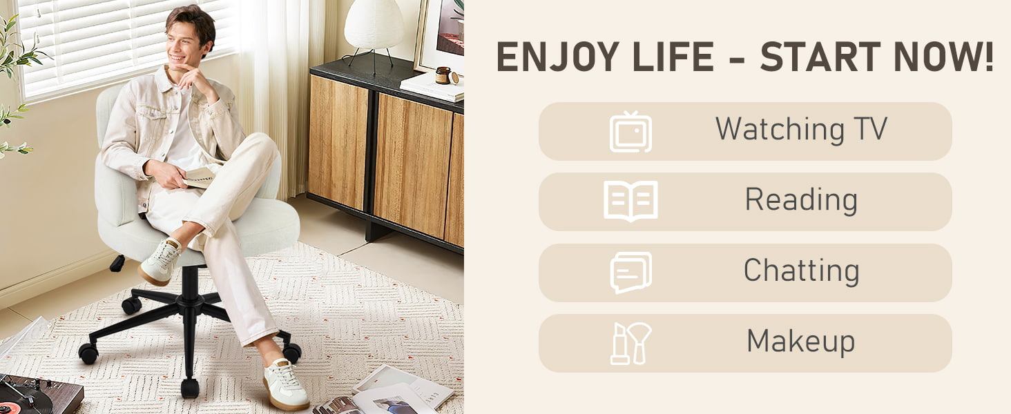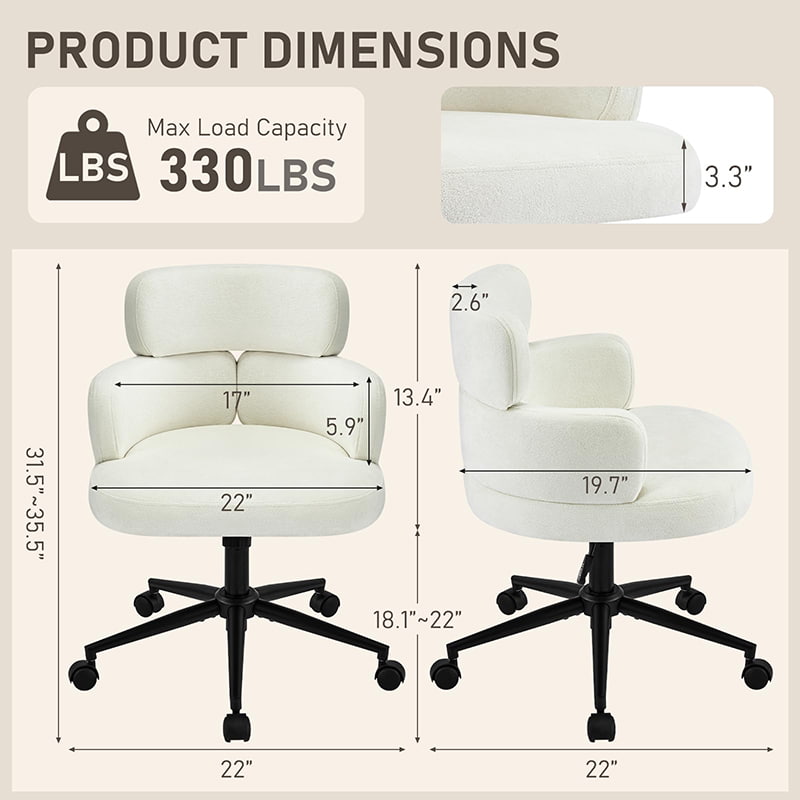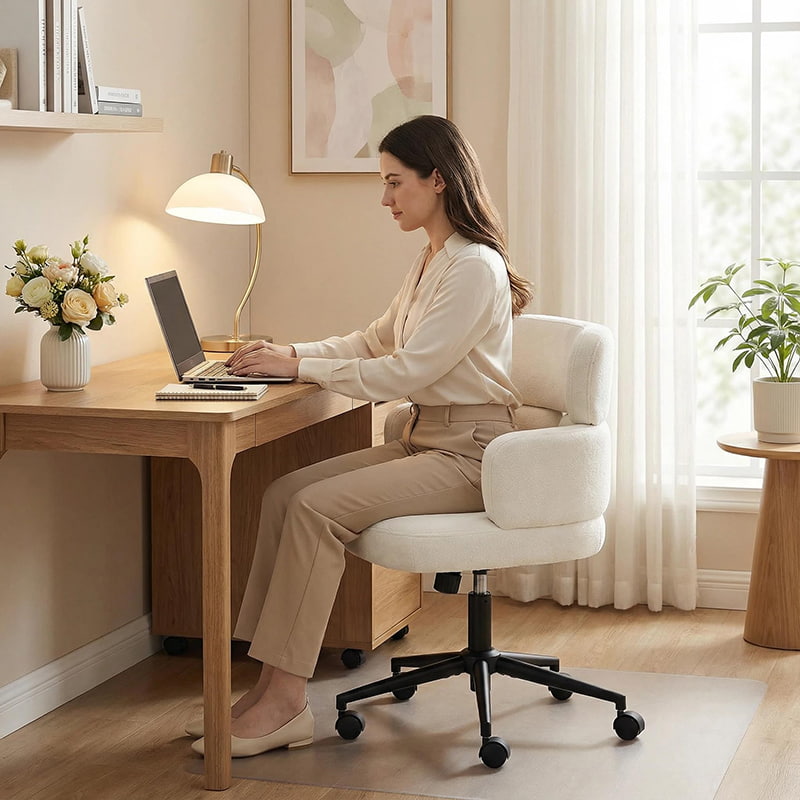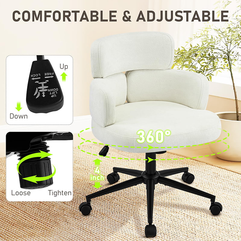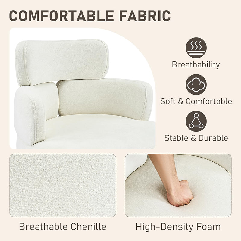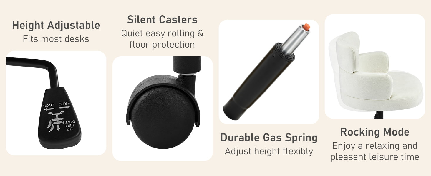Envolta em tecido chenille respirável e apoiada por uma almofada de espuma espessa, a cadeira proporciona conforto duradouro para trabalhar, ler ou relaxar. Altura ajustável do assento, giro suave de 360° e função de balanço suave permitem que os usuários personalizem facilmente sua posição sentada. Uma base de metal resistente com rodízios silenciosos garante estabilidade, mobilidade e proteção do piso, tornando-a uma solução de assento prática e elegante para a vida contemporânea.