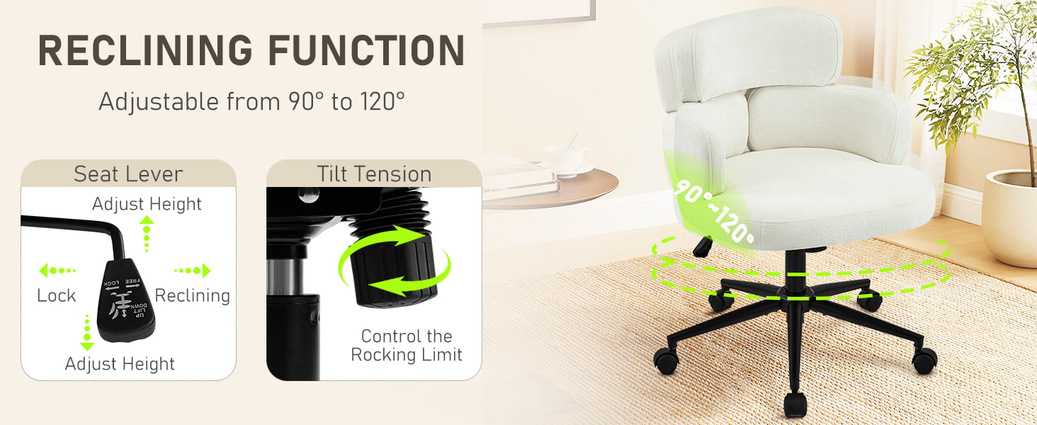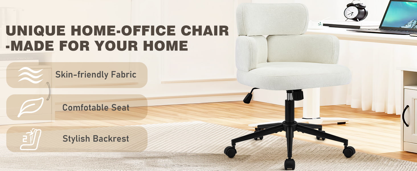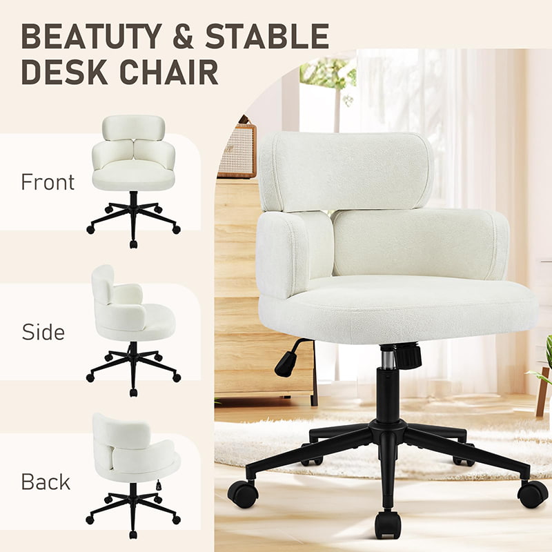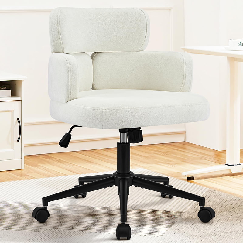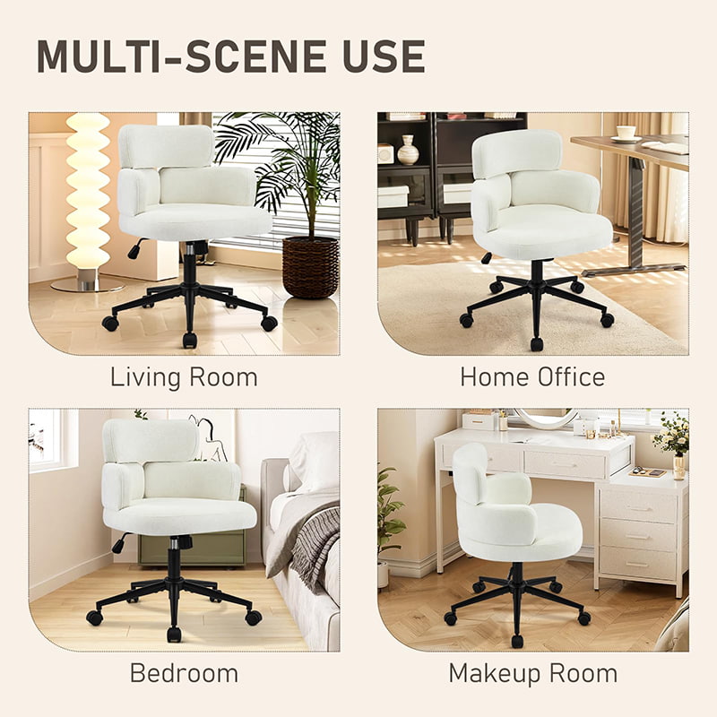 Esta cadeira de escritório giratória estofada foi projetada para escritórios domésticos modernos, espaços de trabalho boutique e interiores voltados para o estilo de vida. Apresentando um encosto distinto em forma de trevo com apoio de braço integrado, esta cadeira combina apelo visual com ergonomia funcional. O assento amplo e suavemente acolchoado é estofado em tecido chenille adequado para a pele, oferecendo uma experiência de assento macia e confortável para longas horas de trabalho, leitura ou relaxamento. Um mecanismo de altura ajustável, giro suave de 360 graus e função de balanço suave permitem que os usuários personalizem sua posição de assento com facilidade, enquanto a base de metal resistente e rodízios silenciosos garantem estabilidade, mobilidade e proteção do piso em diferentes ambientes.