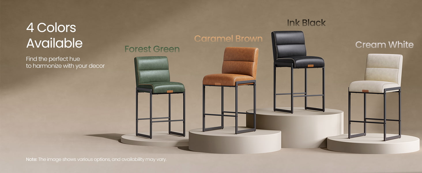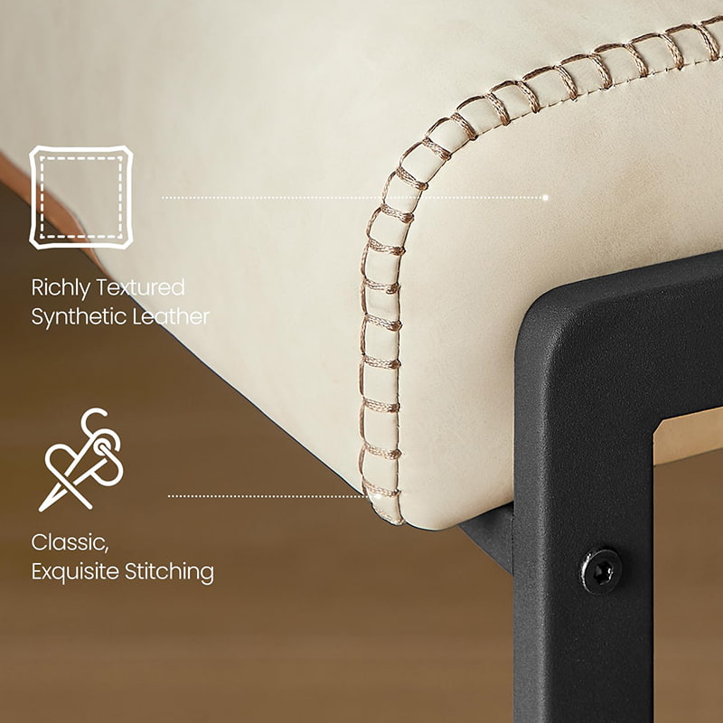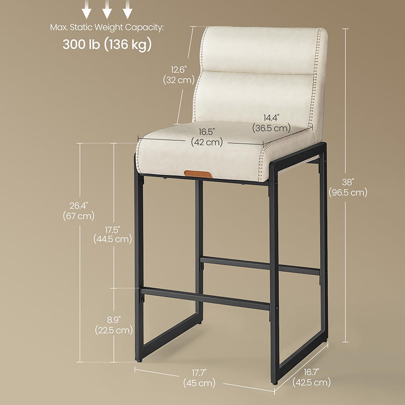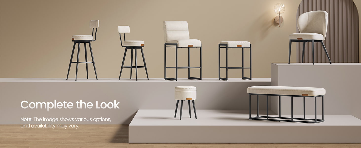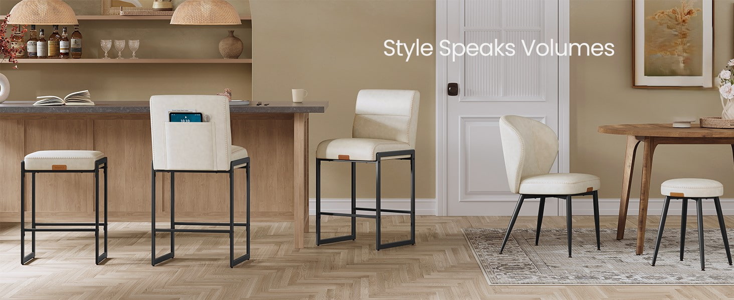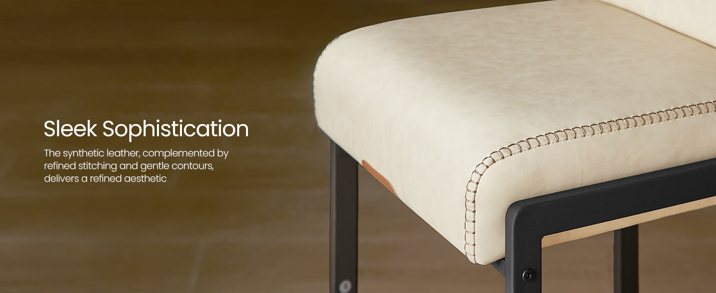 Bancos de bar modernos de meados do século projetados para balcões de cozinha e ilhas de jantar, essas cadeiras de altura branca creme apresentam estofamento de couro sintético durável com costura refinada e uma estrutura de metal arquitetônica limpa. O encosto ergonômico segmentado de 103 graus, o assento acolchoado de 3,9 polegadas de espessura e a borda frontal curva proporcionam conforto duradouro para assentos prolongados, tornando-os adequados tanto para cozinhas residenciais quanto para ambientes comerciais leves, como cafés ou showrooms.