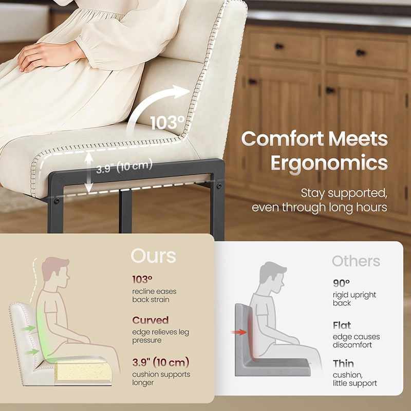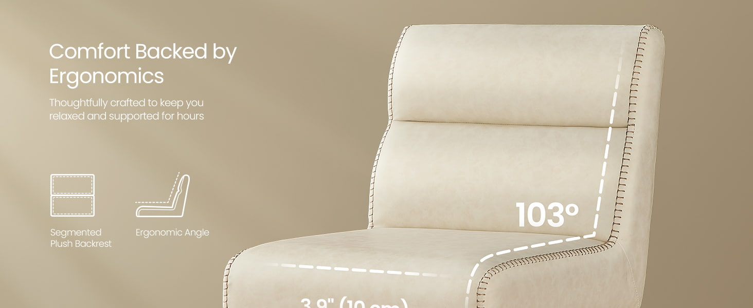 saber maisEste banco de bar moderno de meados do século combina estrutura de metal com forro limpo com estofamento de couro sintético branco creme macio para uma solução de assento refinada, mas prática. Projetada para ilhas de cozinha e balcões de jantar, a cadeira possui assento generosamente acolchoado e encosto segmentado com ângulo de 103°, oferecendo suporte ergonômico equilibrado para o uso diário.