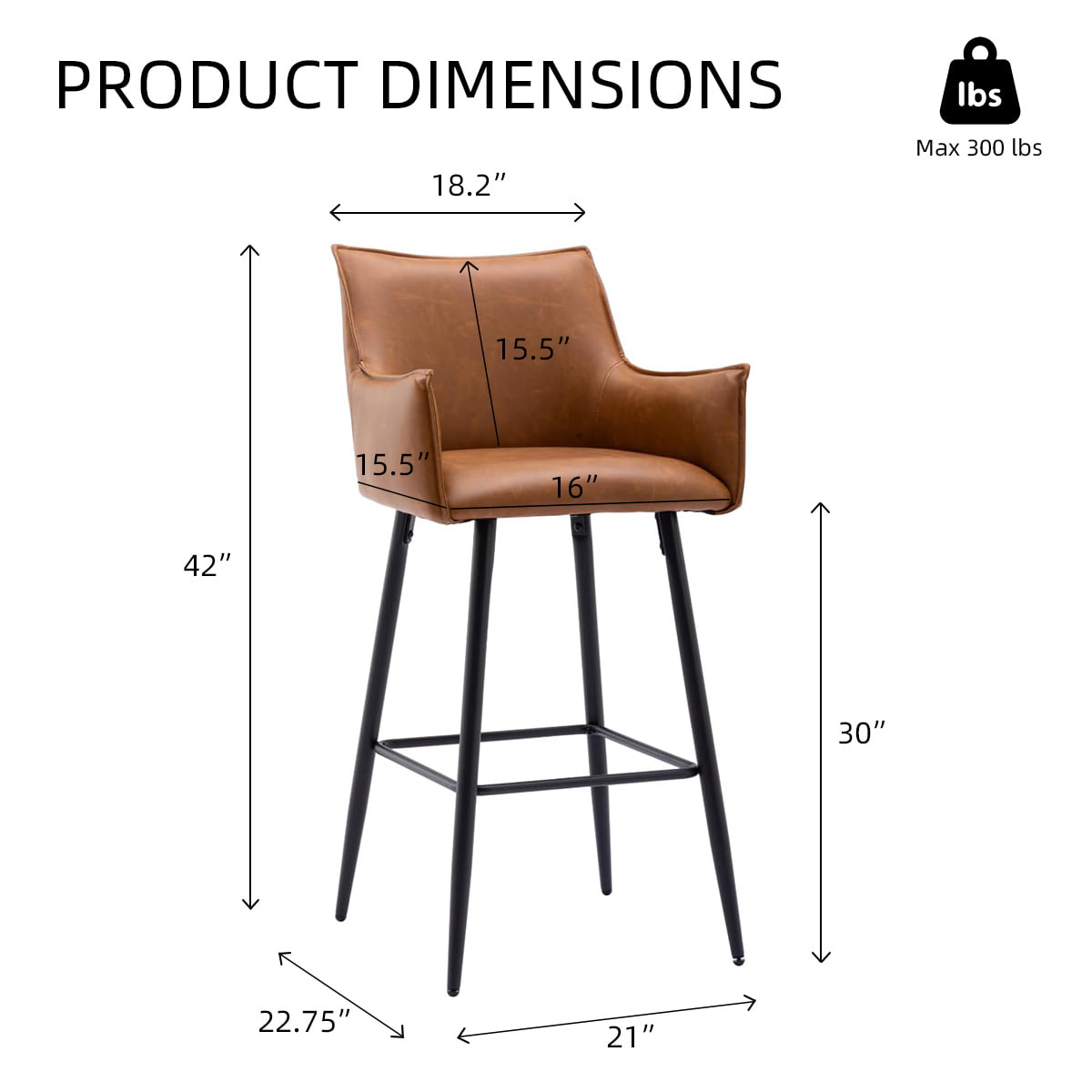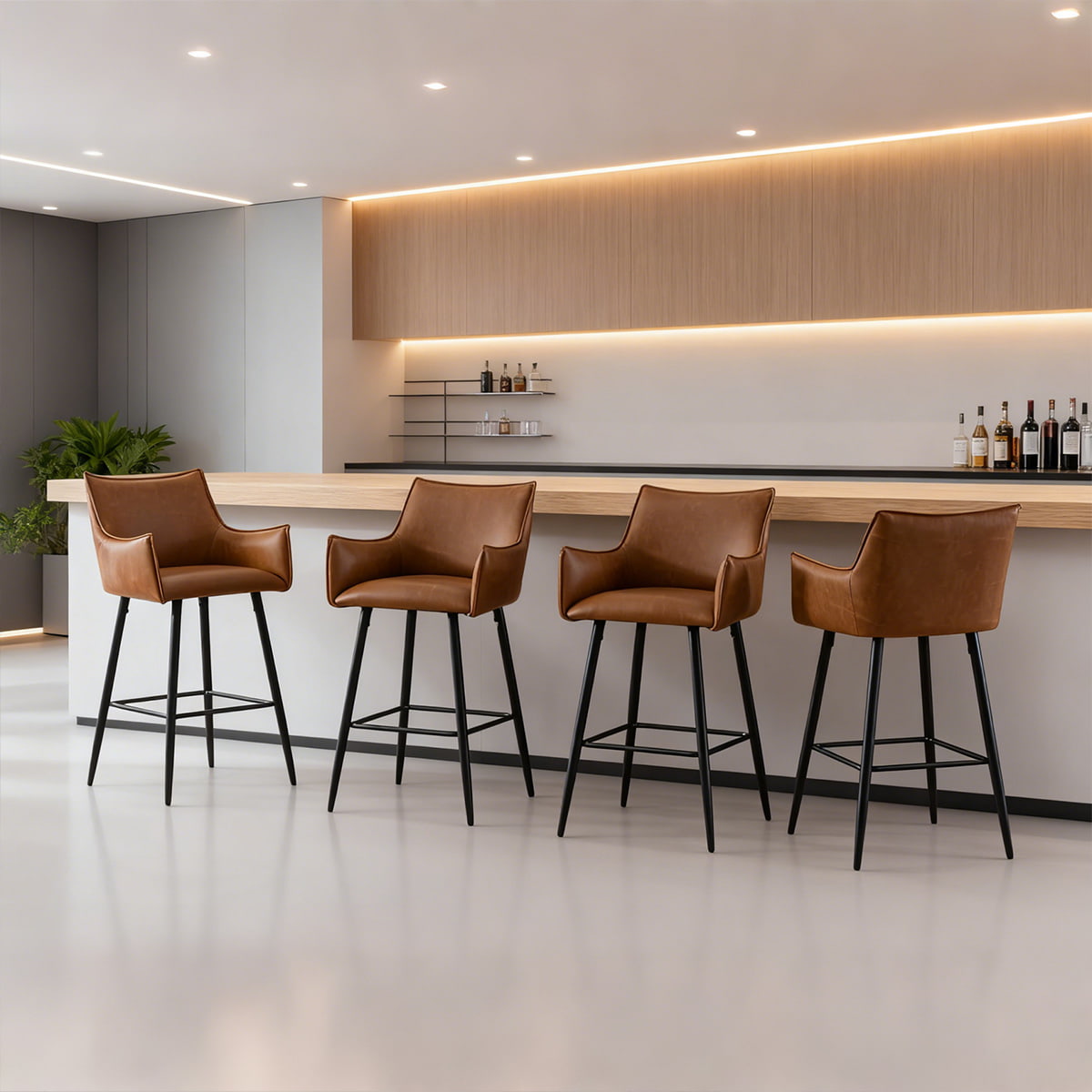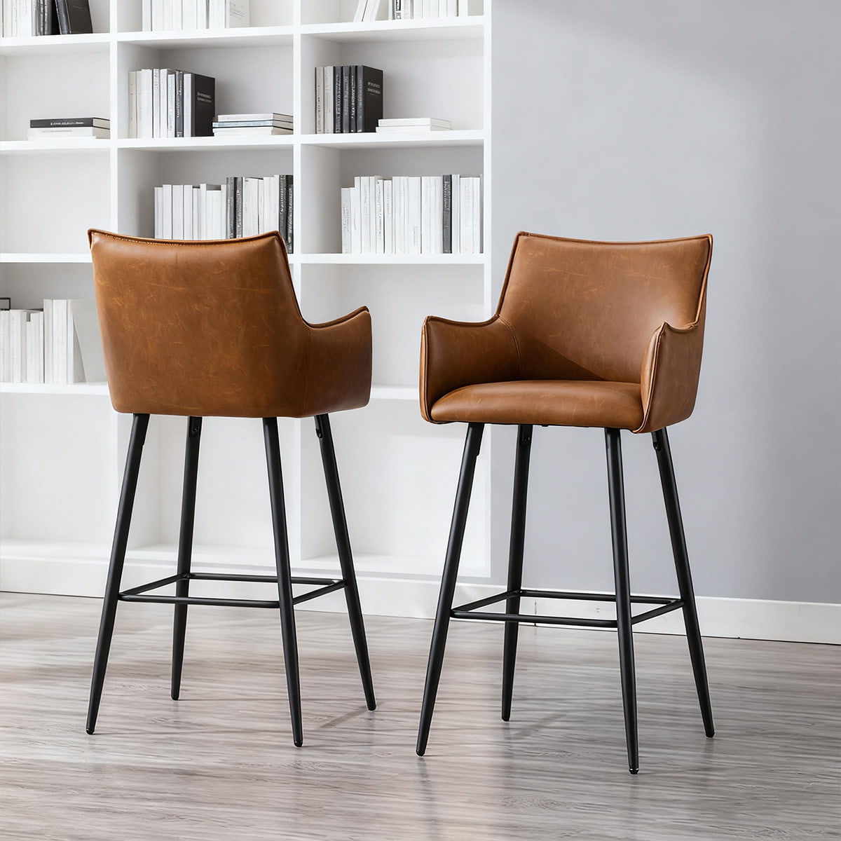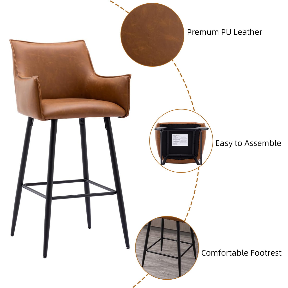 Banco de bar moderno em couro PU marrom com braços e encosto - Cadeira de bar estofada na altura do balcão com pernas de metal preto para ilha de cozinha, bistrô ou bar doméstico